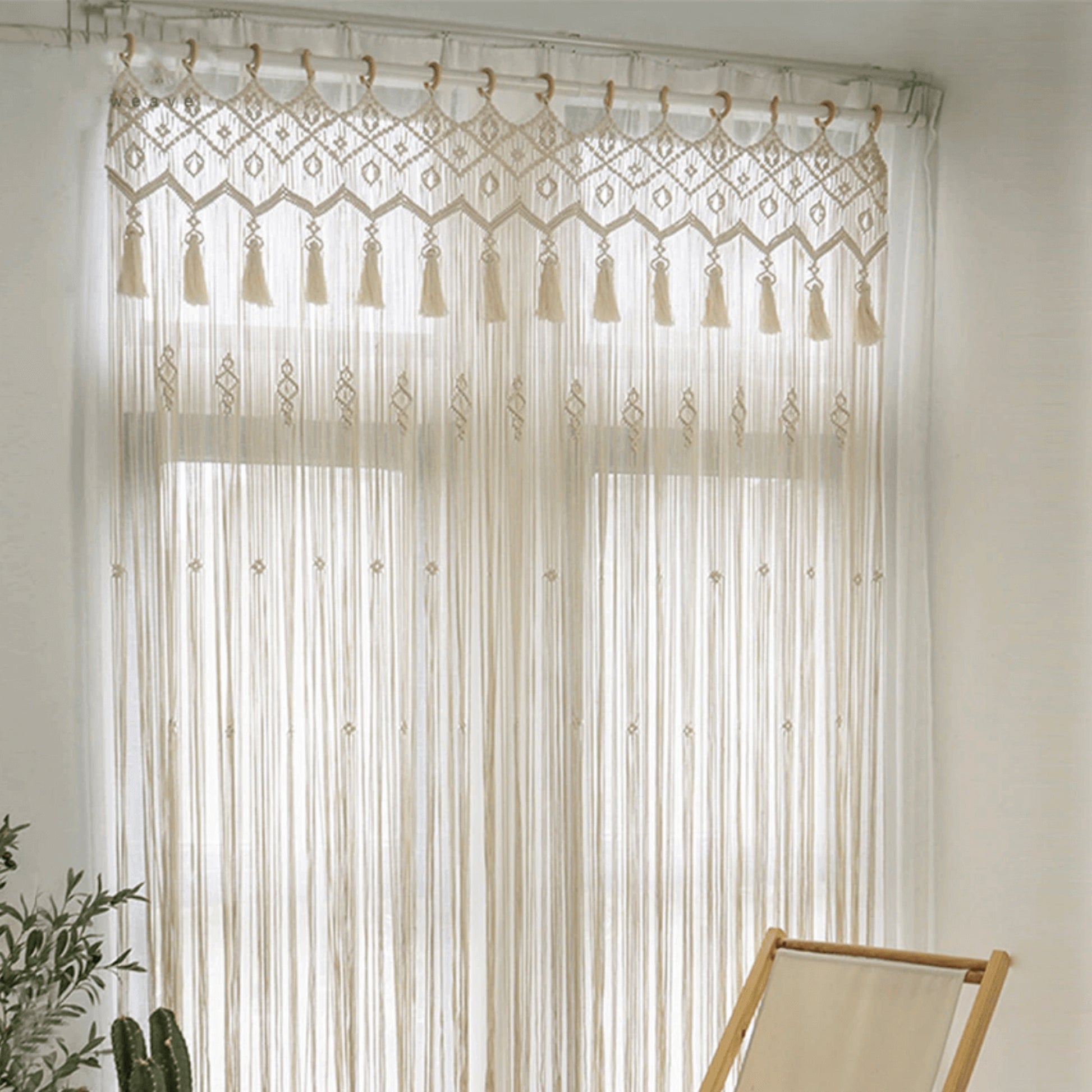 La cortina tiene una parte superior en forma de túnel, lo que facilita su sujeción a una barra de cortina.  Esta decoración de macramé hecha a mano añadirá un encantador toque bohemio a tu hogar.